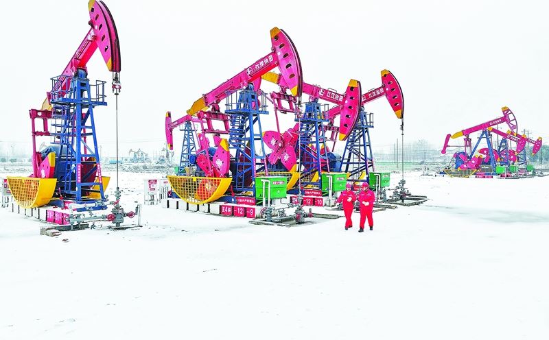 2月21日,江汉油田员工顶风冒雪巡井保上产。宋国梁 摄