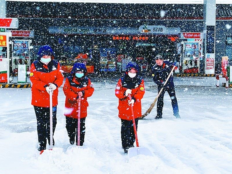 2月20日,河南郑州石油登封城西加能站员工积极清扫积雪,保障现场加油有序、道路畅通。刘畅 摄