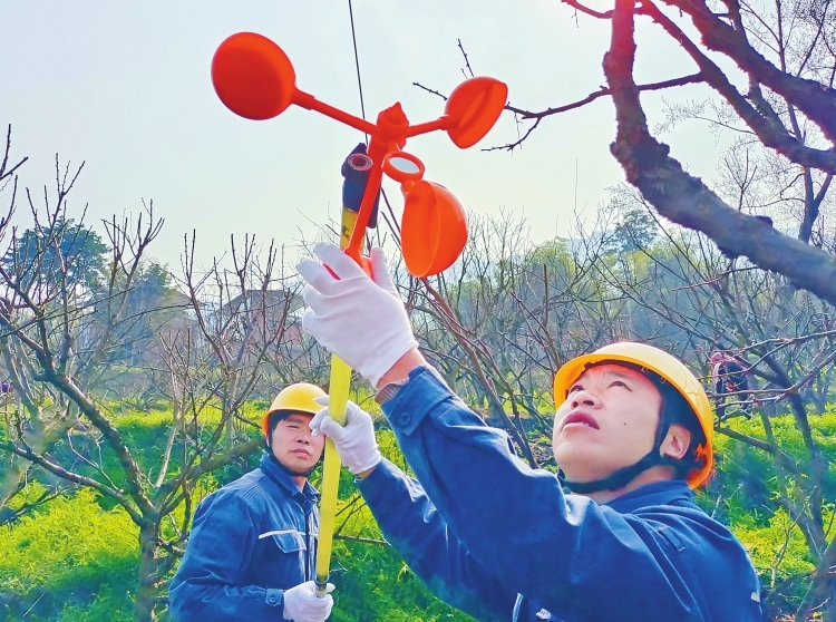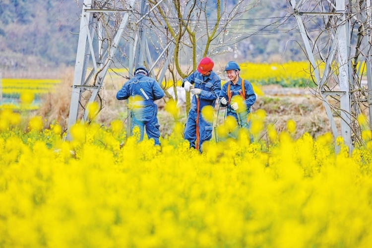 2月19日,云南电网公司昭通绥江供电局工作人员带电安装线路驱鸟器。凌征秀 摄