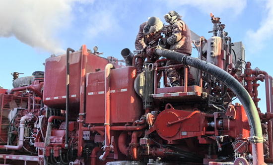 图为2月18日,员工在极寒天气下精细操作固井水泥车。