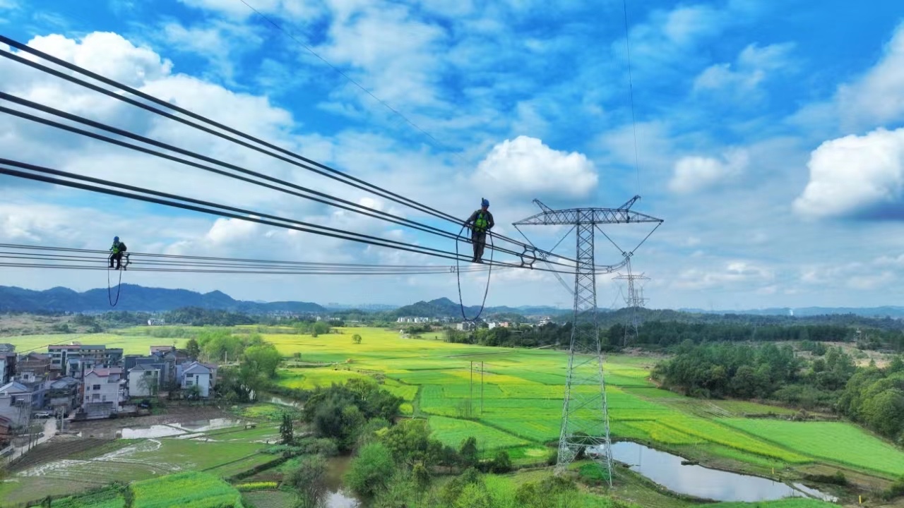 在油菜花田上方的近百米高空,首条过境江西的±800千伏宾金特高压输电线路,在这里进行一年一度的计划检修作业。