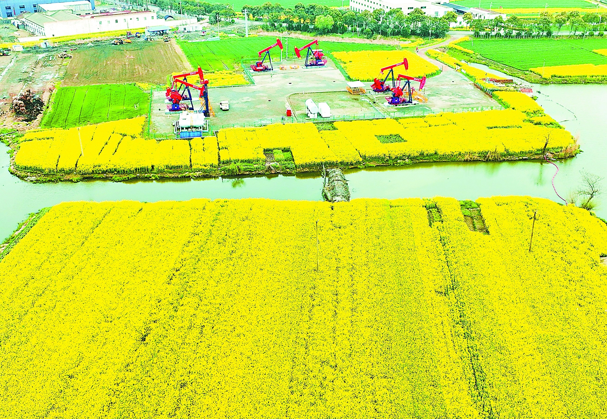 截至3月底,华东油气分公司建成21个二氧化碳驱开发单元,覆盖储量1723万吨,占油田总储量30%。该公司应用二氧化碳驱油30多年来,累计注气150万吨,增油83万吨,二氧化碳驱油成为“苏北老区不老”的“驻颜”秘方。图为该公司二氧化碳驱示范基地草中1-6井生产平台春色。 (沈志军 摄 王 许 宋宗旭 文)