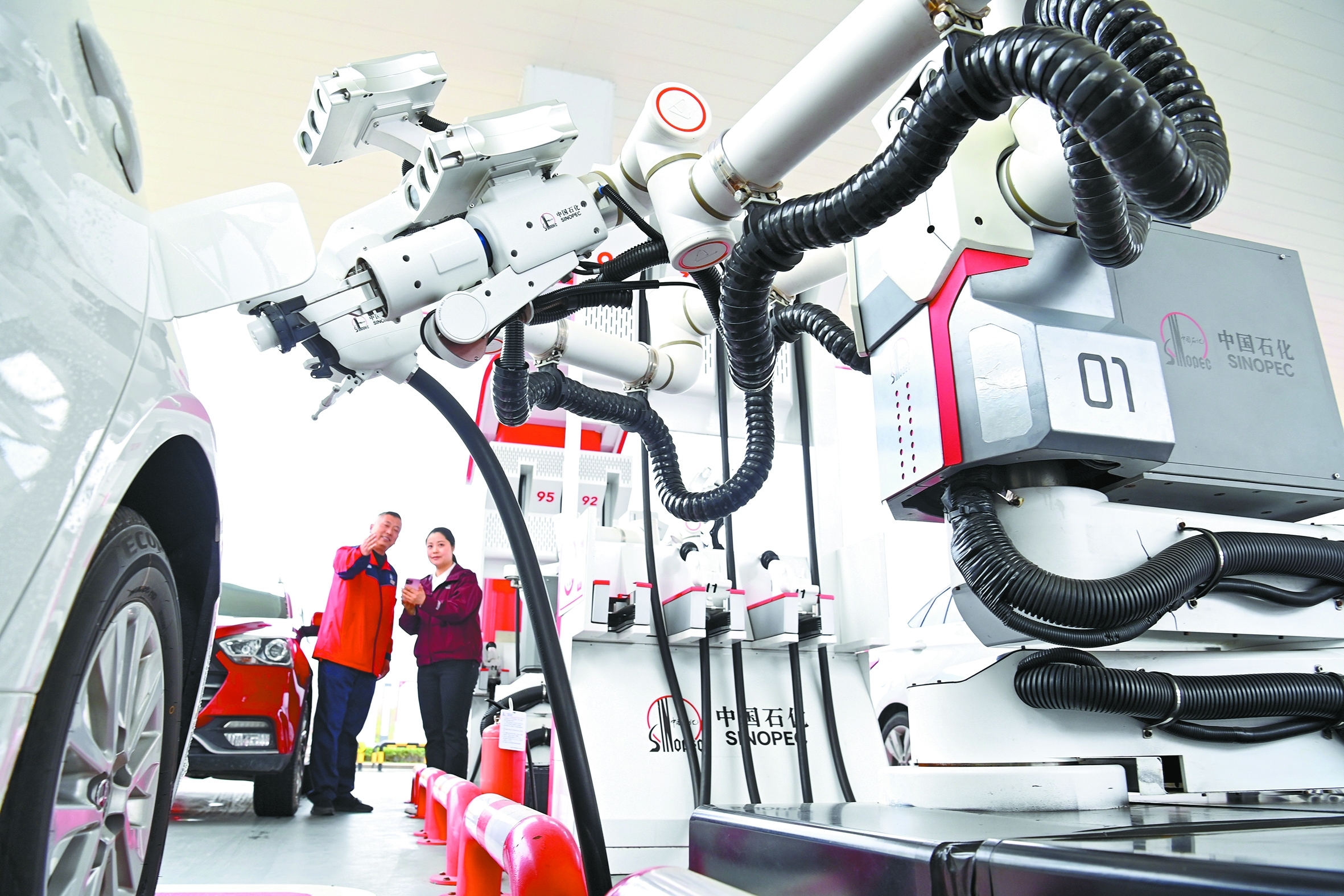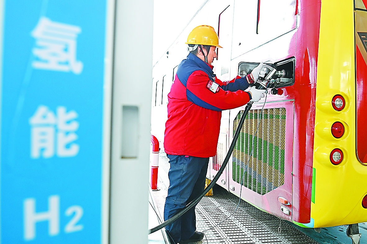 芜湖石油马饮桥综合加能站员工为公交车加注氢燃料。
