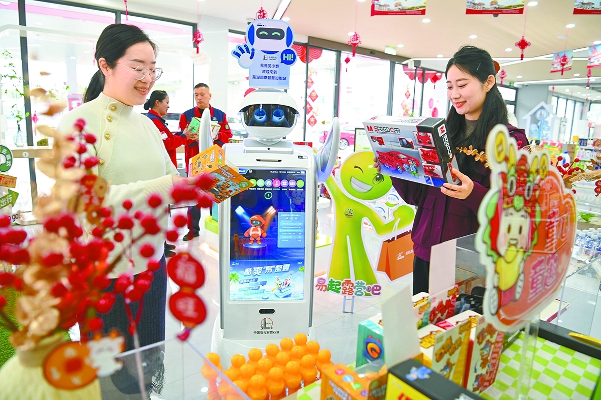 芜湖石油国泰加能站的易捷便利店里配置了智能导购机器人,让顾客购物更加舒心、方便。