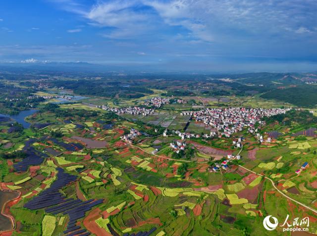 4月23日,江西省吉安市永新县莲洲乡,阡陌纵横,房屋林立,蓝天白云与绿树青山交织映衬,乡村美景怡人。