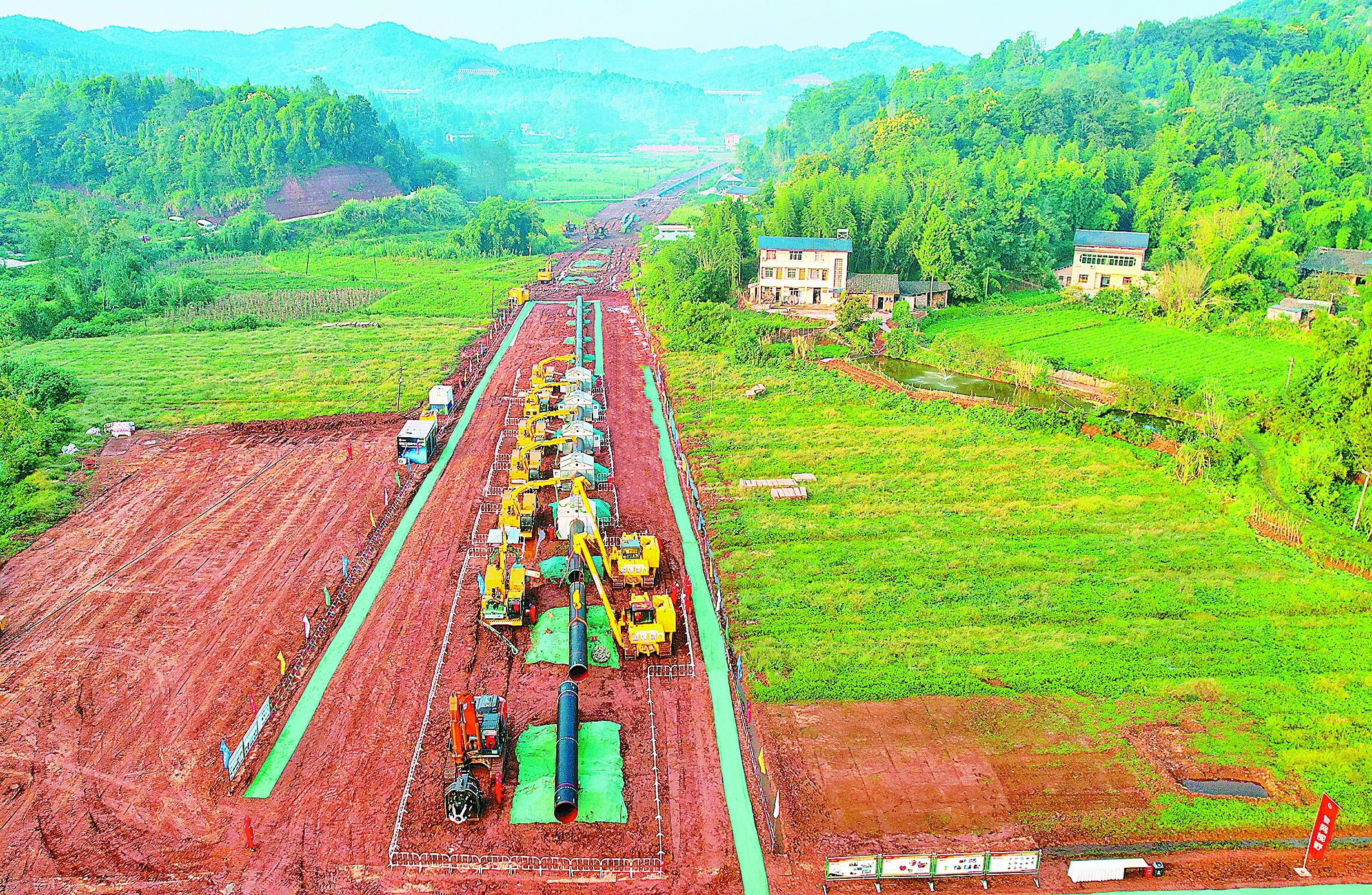在川气东送二线天然气管道(威远/泸县—铜梁)线路第三标段主体管线施工中,石油工程建设公司江汉油建大力开展管理标准化、行为标准化、作业标准化、环境标准化和智能工地“四化一智”建设,实现施工安全优质高效推进,截至5月10日建设进度超62%,连续7个月全线综合进度第一。图为施工现场。(张 龙 摄 胡学珍 文)