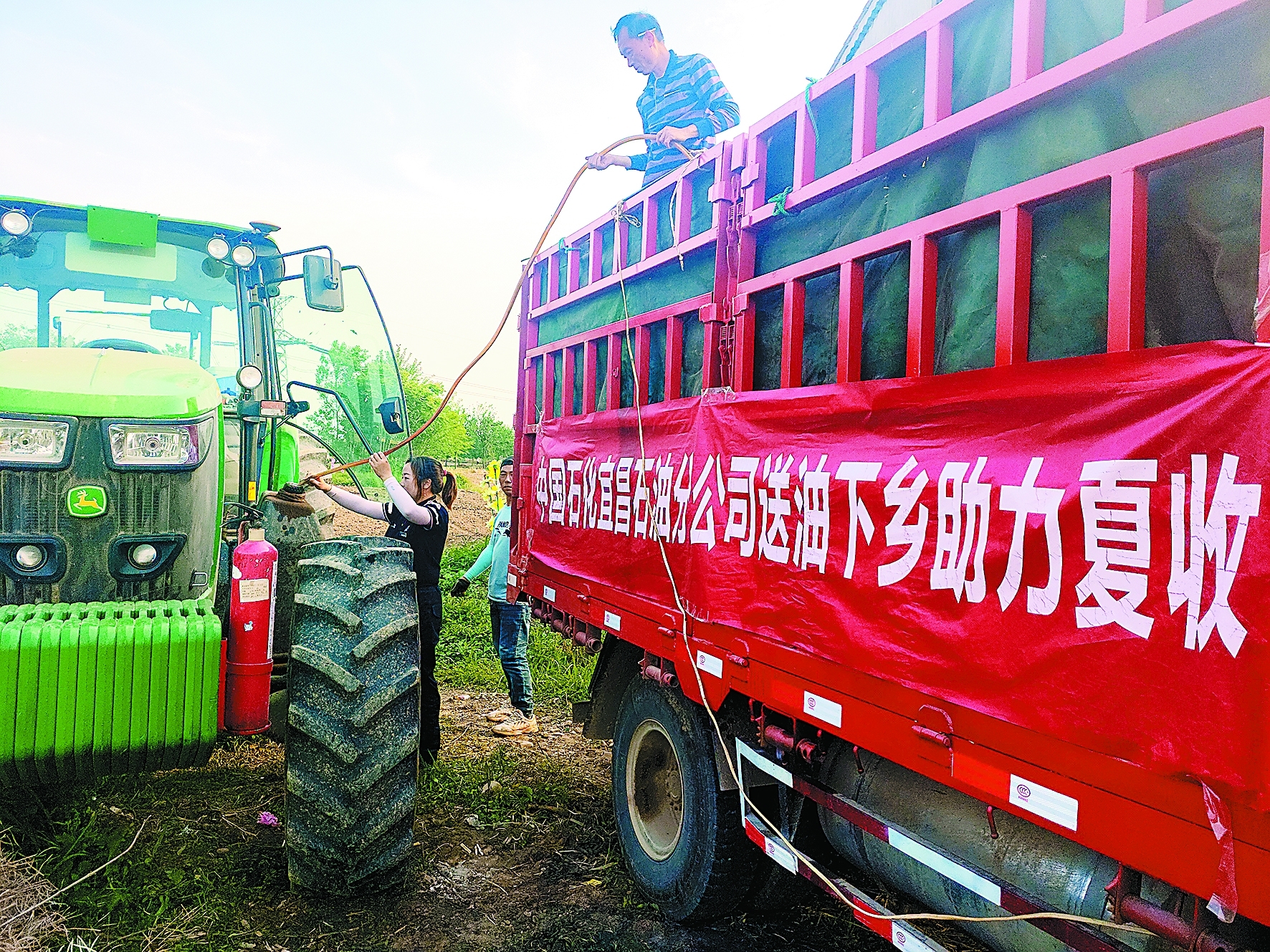 5月以来,“三夏”用油需求日益增多,湖北宜昌石油坚持优先加油、优惠供应、优质服务,在全市设置40余座“三夏”用油保供站,在站点内开通绿色通道,提供送油到田间地头服务,保障农机作业用油。图为5月9日七星台加能站员工到田间地头送油。(董泽惠 摄 龚华林 文)