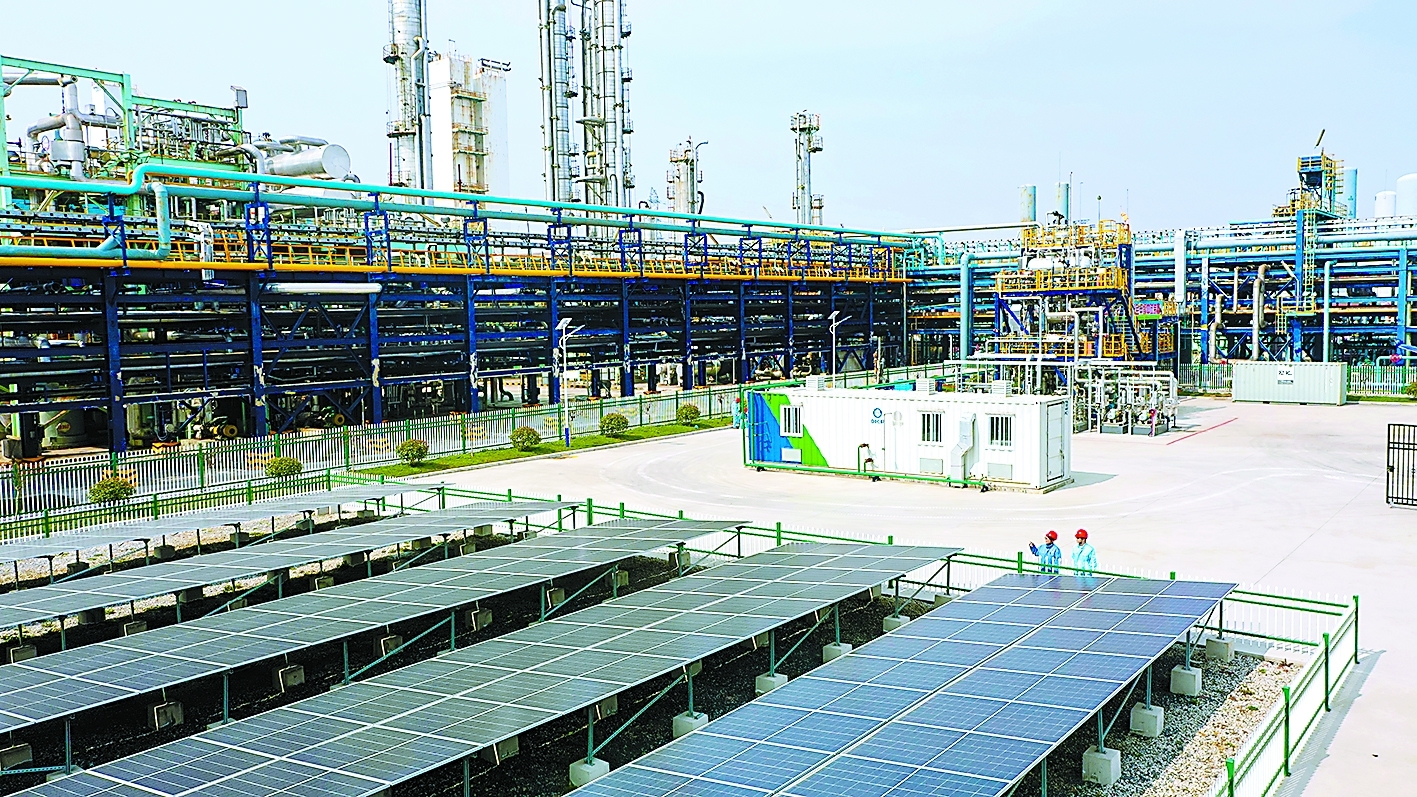 中国石化南化公司百吨级绿色甲醇中试装置,采用光伏发电、电解水制氢、二氧化碳加氢制绿色甲醇工艺,日平均发电量1154千瓦时,转化率等指标居国内领先水平。图为装置现场。杨 刚 摄 郑 瑞 文