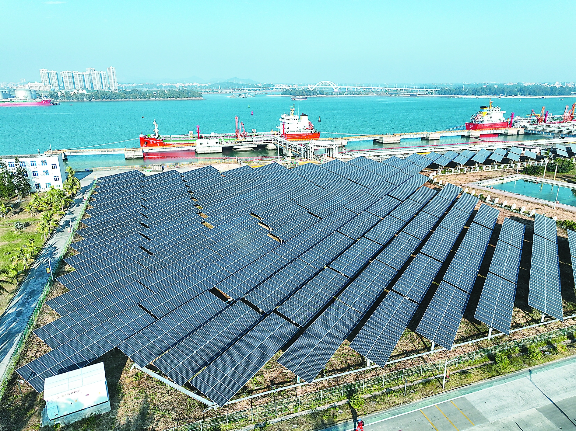 茂名石化目前已建成光伏项目36兆瓦,年发绿电量可达4400万千瓦时,年减碳量2.5万吨。图为茂名石化港口一区光伏发电项目。柯裕清 摄 程方军 文