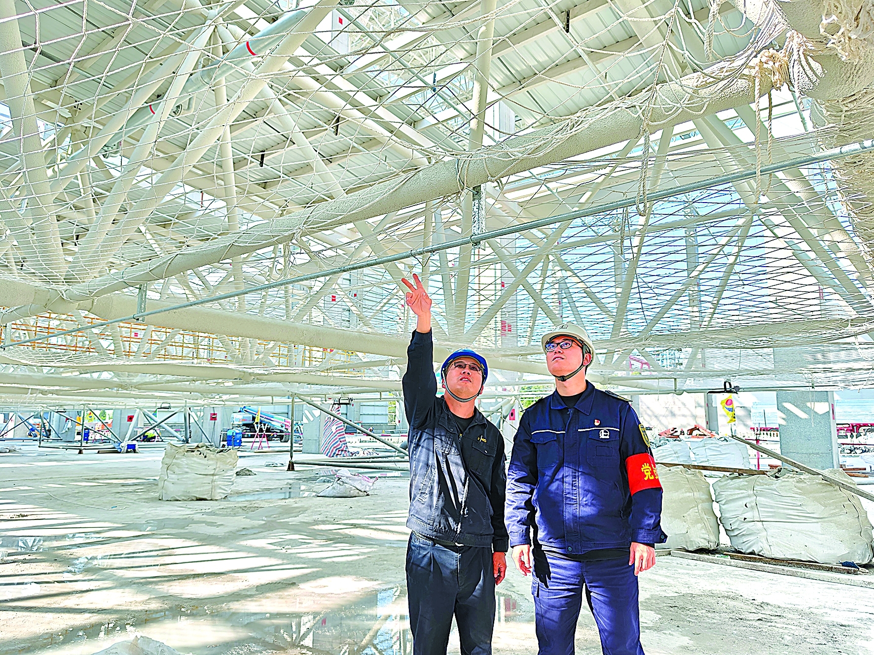 近日,中国石化质监总站宁波监督站顺利完成镇海基地聚烯烃3号立体库超大钢网架安装的质量监督工作,为主体结构工程质量安全保驾护航。该聚烯烃立体库钢网架目前已成功顶升到位,标志主体结构安装完成。图为监督工程师检查施工质量。陈德升 摄