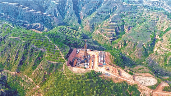 图为50691队钻井现场与沟壑纵横的黄土塬形成一幅和谐优美的生态画卷。