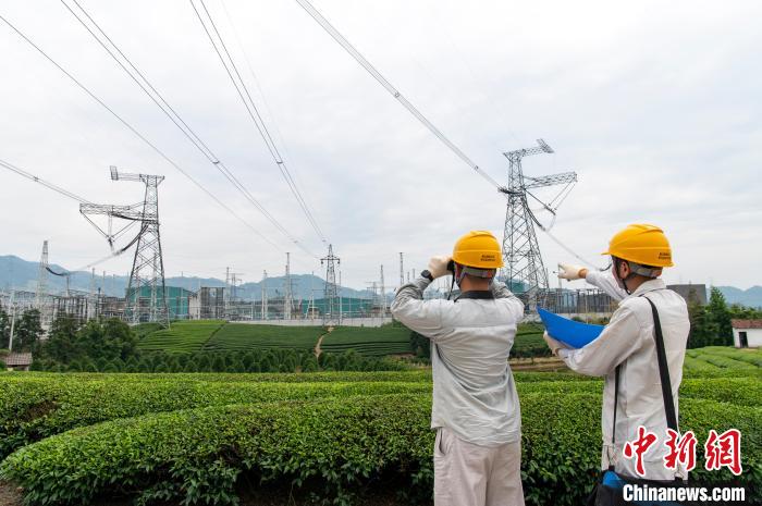溪洛渡左岸—浙江金华±800千伏特高压直流输电工程金华换流站外,电力工人巡视线路。胡肖飞摄