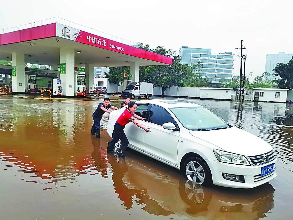 5月19日,广东东莞石油永振兴加能站员工协助客户将熄火车辆推离积水区。徐雪茗摄