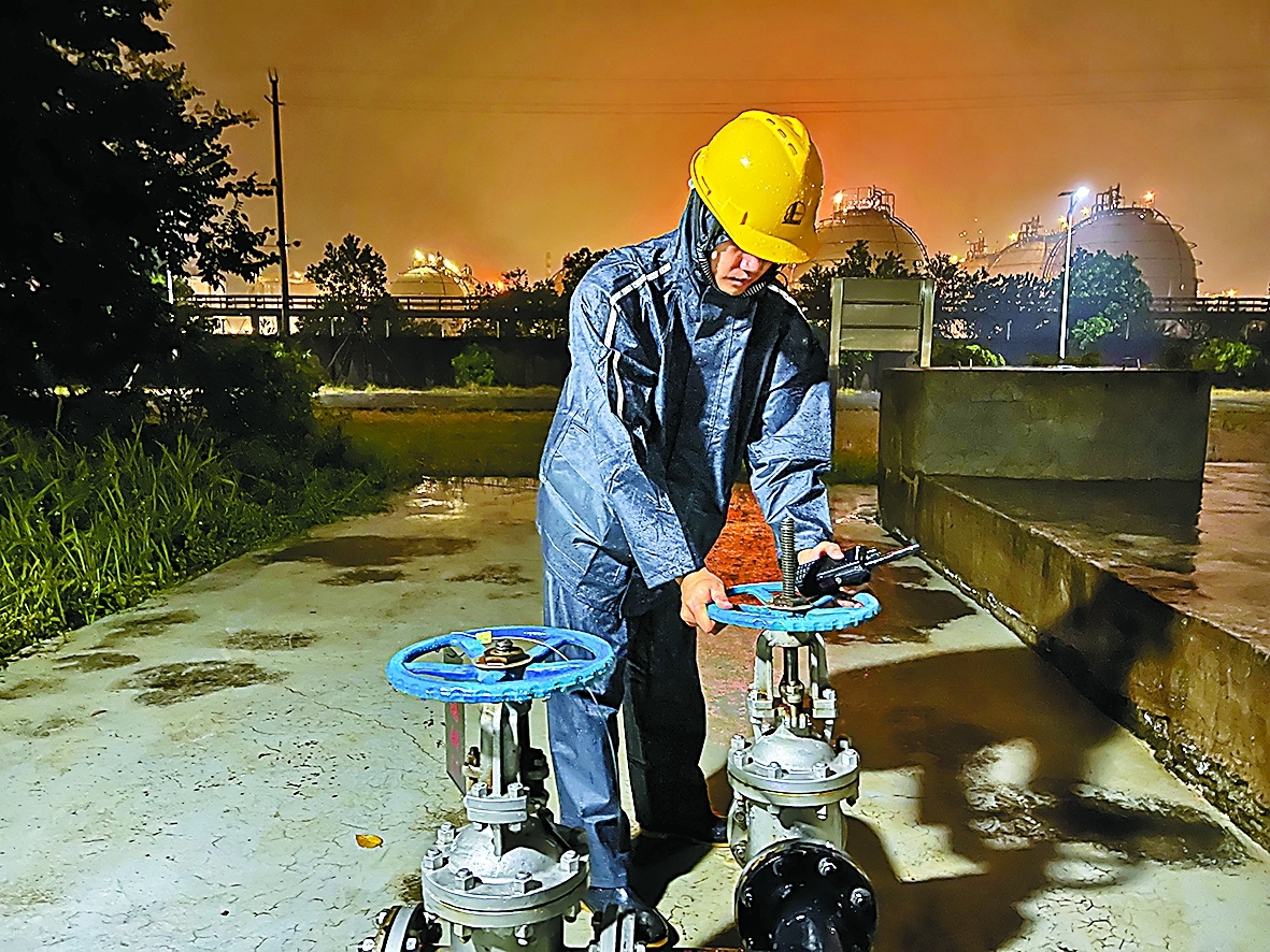 5月19日,茂名石化员工在暴雨中调整操作废水处理装置,确保出水合格率100%。张木旺摄