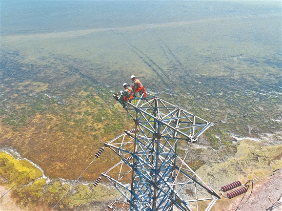 5月20日,在冀东油田35千伏架空线路滩庙332线电塔上,电力员工蔡文华(左)和纪振秋在更换避雷线。