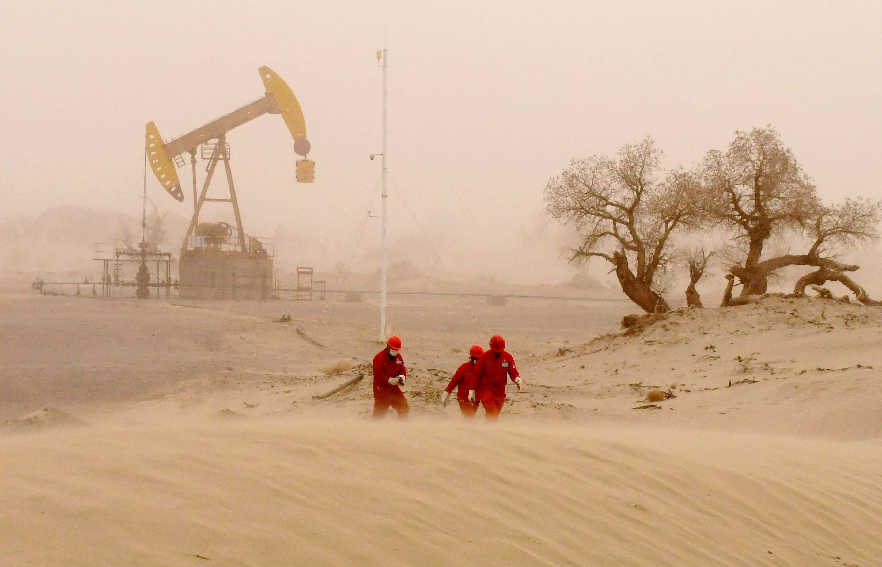 日前,沙尘暴侵袭西北油田塔河油区,给油井正常生产带来较大影响,西北油田采油一厂员工坚守岗位,加密油井巡检次数,及时消除生产异常,确保油井正常生产。图为4月1日,员工迎着沙尘查看TK537井生产情况。孔守曾 摄