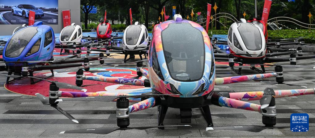 广州低空航展上展示的亿航智能EH216系列产品(载人机、物流机、消防机)“全家福”(6月3日摄)。