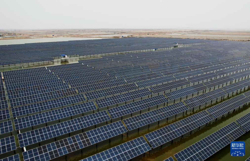 近年来,河北省沧州市加快清洁能源开发利用,依托沿海滩涂、水产品养殖场、盐场等资源,发展“渔光互补”、风电等清洁能源项目。据国网沧州市供电公司介绍,目前该市风电、光伏发电和生物质发电等清洁能源装机容量达722万千瓦。(新华社记者 杨世尧 摄)