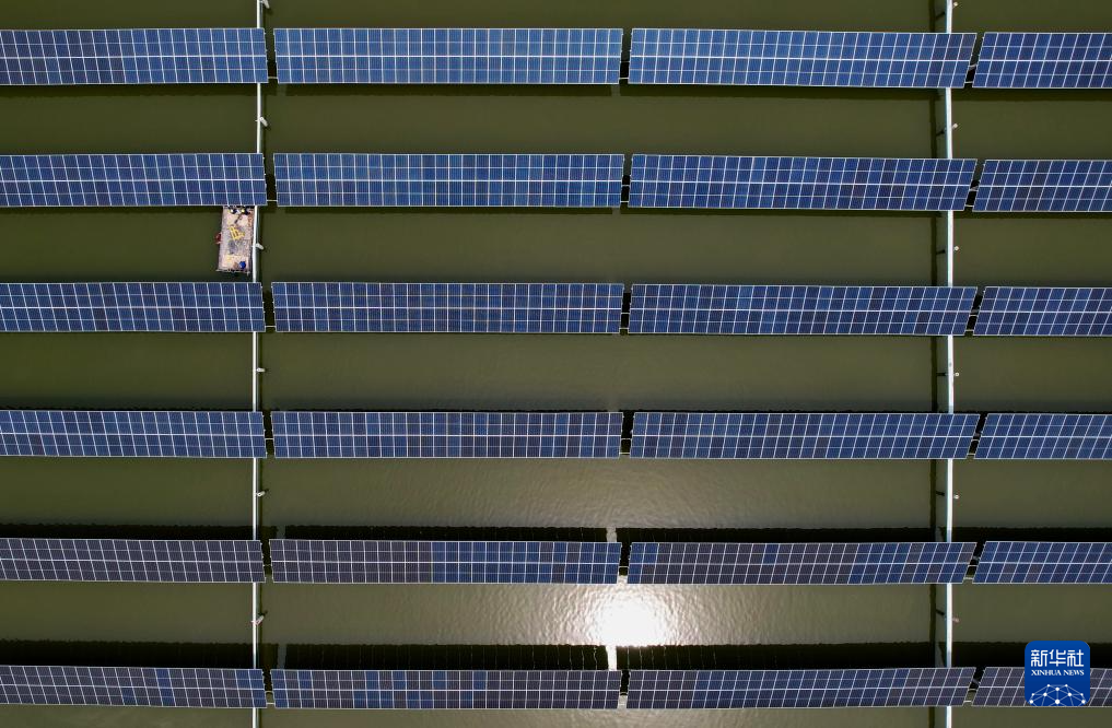 6月5日,工人在河北省沧州市渤海新区黄骅市南排河镇一处“渔光互补”光伏发电场检查输电设备(无人机照片)。