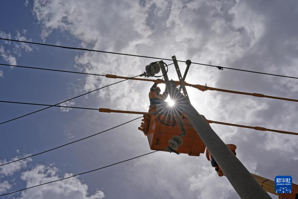 近日,宁夏银川迎来高温天气,电网负荷随之不断攀升。国网银川供电公司带电作业中心员工冒着高温,进行带电作业,保障夏季用电高峰期电网安全稳定运行。 (王鹏 摄)