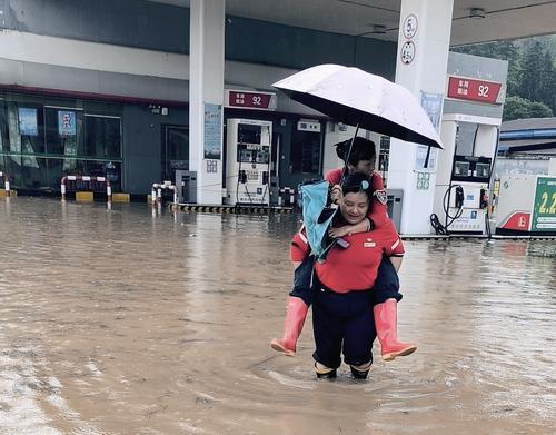 6月15日,受暴雨洪水影响,福建南平浦城城北加能站被洪水倒灌,现场积水深度达1.6米。南平石油立即启动应急预案,关闭电源、停止营业,站内人员撤离至站外地势高处。图为该站员工帮助脚受伤的同事撤离。石蕾 摄 王鸿儒 文