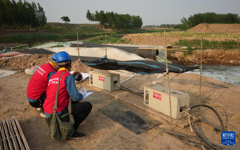 6月18日,在山东省巨野县麒麟镇的一处抗旱应急取水点,国网巨野县供电公司的工作人员在检查水泵的供电线路。