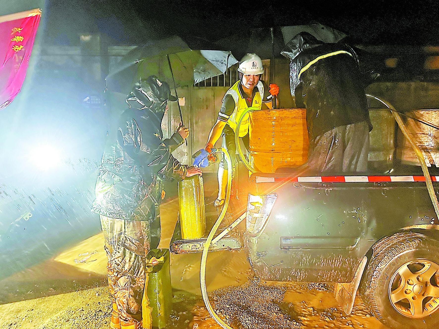 图为6月23日晚,安徽黄山石油抢险人员为重灾区歙县绍廉乡救灾车辆送去1800升油品。