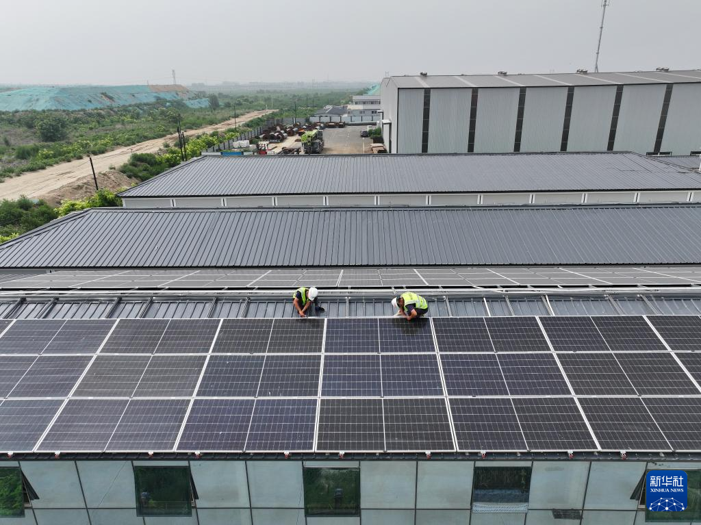 7月12日,工人在雄忻高铁雄安地下段及相关工程7标项目部管理人员生活区屋顶检修光伏发电设施(无人机照片)。