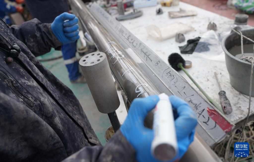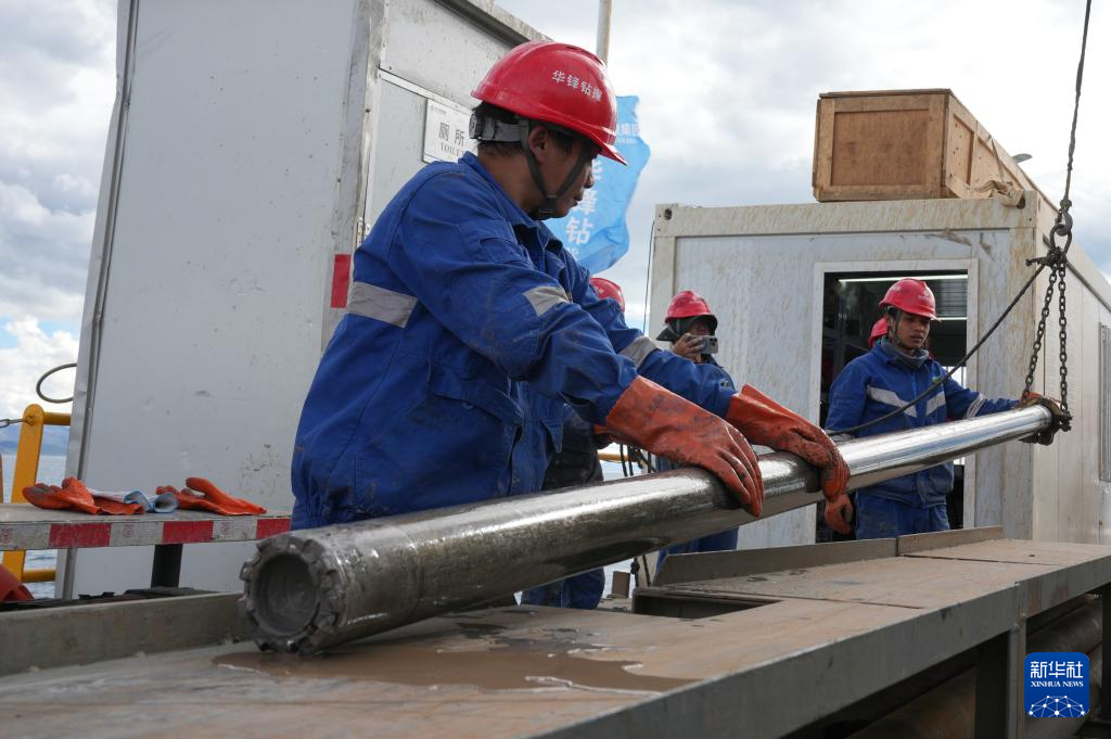 7月12日,钻探队员提取纳木错湖底402.2米深度湖泊岩芯样品。新华社记者晋美多吉摄