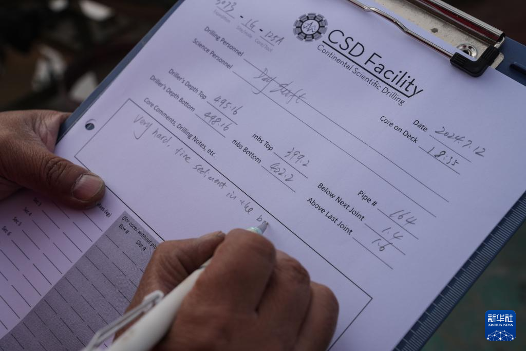 7月12日,科研队员在登记纳木错湖底402.2米深度湖泊岩芯样品信息。新华社记者晋美多吉摄