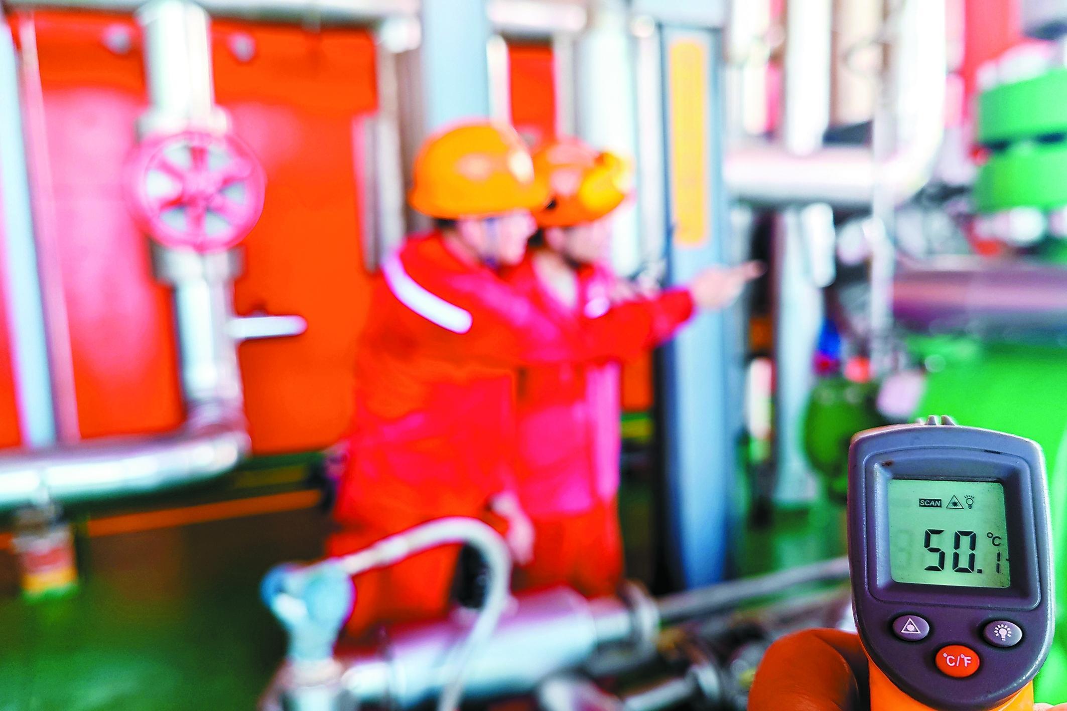 胜利油田海洋采油厂积极应对高温、强降雨对海上生产带来的不利影响,加大设备设施巡检力度,并严格落实重点设备特护措施,以确保海上油气生产安全。(张 灿 图/文)