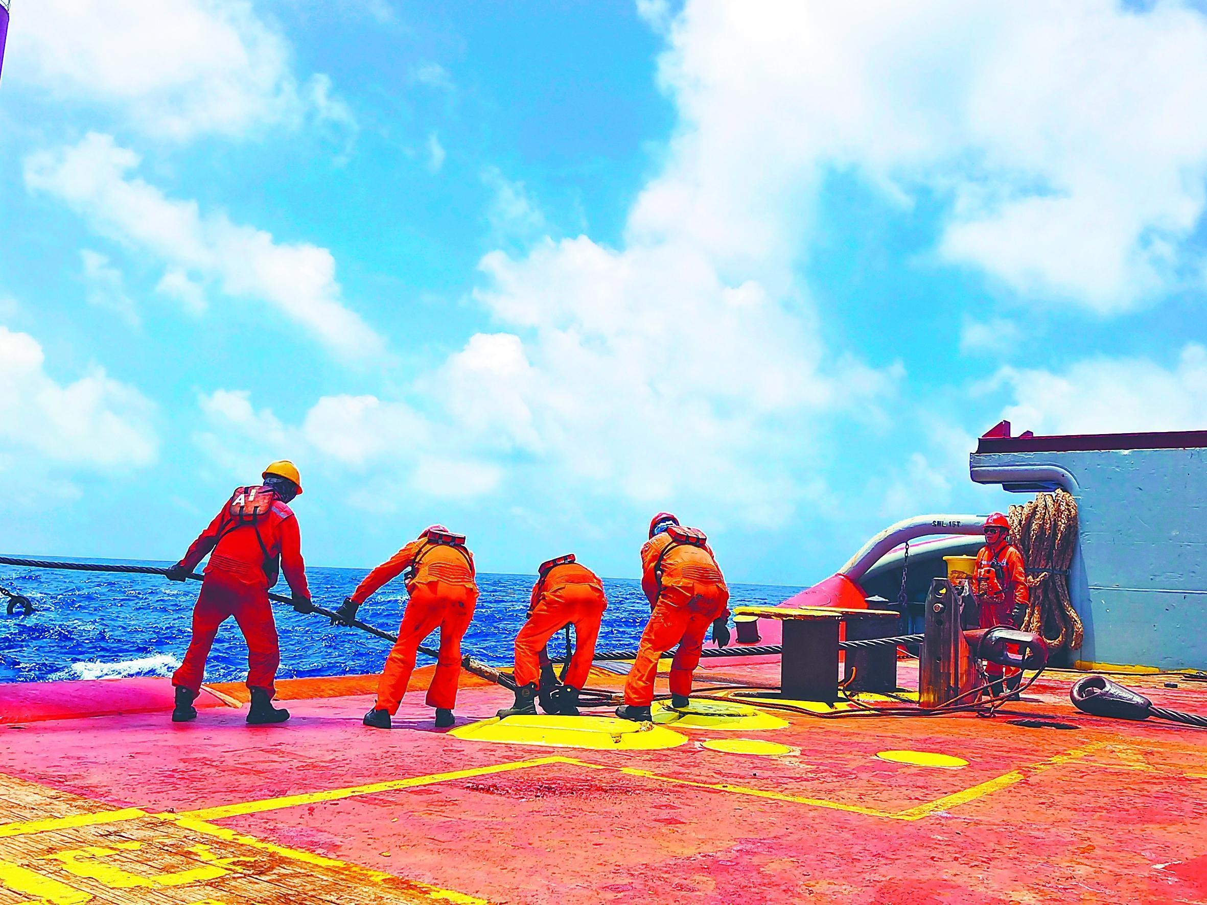 迎着滚滚热浪,海洋石油工程公司勘探225轮船员们全副武装,做好防暑降温措施,同时对抛锚拖航等大型作业设备进行检修,以确保船舶安全平稳运行。图为勘探225轮船员在修理锚链。(宋敬月 图/文)