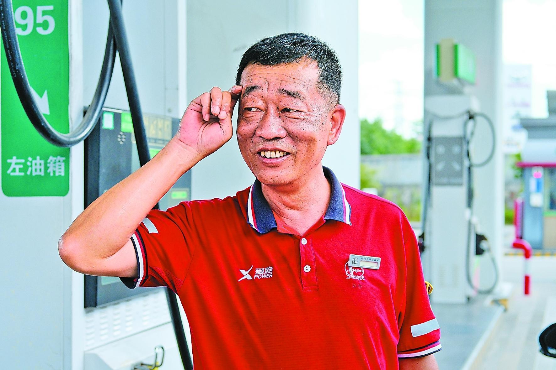 湖南衡阳石油万隆基加能站内,营业员程永忠在营业厅与加油区之间奔跑穿梭。这座站因其特殊的“异形”设计,营业厅与加油区之间相隔一段不短的距离,这对55岁的程永忠来说,无疑是体力与耐力的双重考验。每当顾客呼唤服务时,程永忠总是第一时间响应,汗珠沿着他晒得黑红的脸颊滑落,衣服紧贴在后背上,服务的热情却丝毫没有减弱。(刘芷杉 图/文)