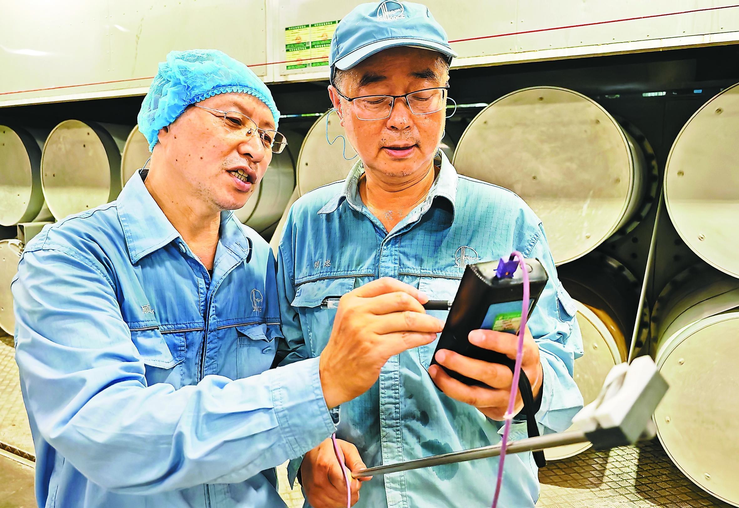 为确保新投产的仪征化纤年产23万吨智能化短纤装置在首个高温季节的安全稳定生产,仪化公司合纤二部成立了技术攻关小组,加强现场设备监护巡检和产品质量检查,以确保装置的安稳长满优运行。图为7月16日下午,温度已达40摄氏度,劳模工作室主任技师顾连岗(左)在巡检途中,指导岗位员工测量智能化短纤装置后纺牵伸辊的温度,保证水刺产品满足质量要求。(刘玉福 图/文)