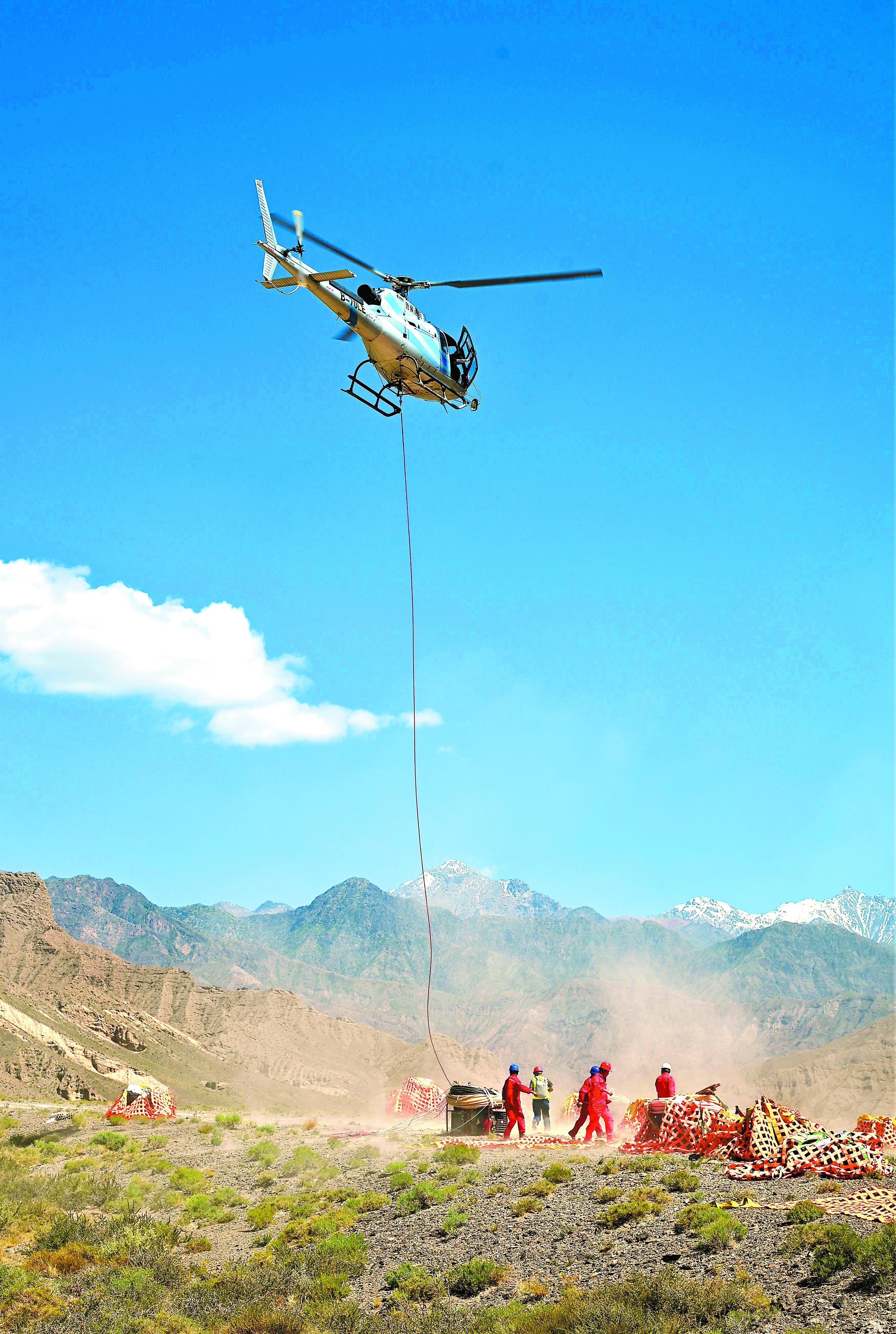 地球物理公司SGC2103队施工的北三维项目是国内目前难度最大的纯山地勘探项目,工区内重峦叠嶂,断崖遍布,因此该项目首次采用直升机进行辅助作业。图为现场作业人员顶着直升机扬起的尘土和烈日,全力以赴助推项目稳步推进。(张广虎 图/文)