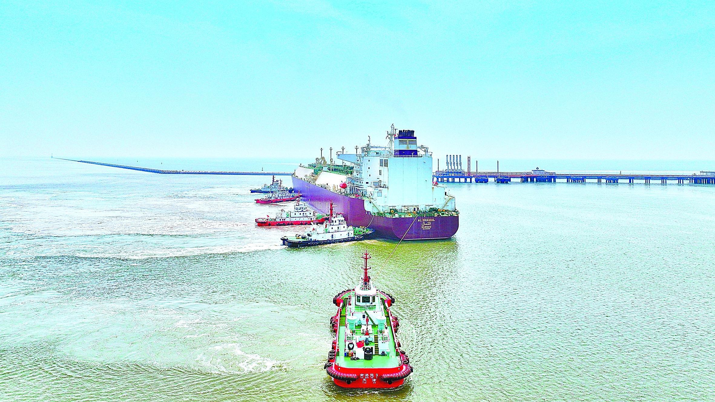 上半年,天然气分公司天津LNG接收站持续优化生产运行,科学制订船期计划,强化全过程风险管控,确保天然气接卸顺畅,累计接卸LNG超200万吨、气化外输天然气超30亿立方米、槽车充装量突破1万车,有力保障华北地区工业和民生用气供应。图为来自卡塔尔的“夏玛尔”号LNG运输船靠泊现场。王 军 摄 王卓然 文
