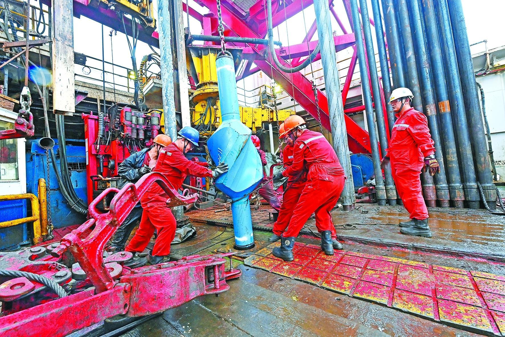 7月15日,上海海洋油气分公司招商区块首口井顺利开钻。该井由钻井分公司勘探四号平台承钻,设计井深4175米,井底温度和压力高、作业难度大,对拓展作业新区、获取基础资料、提升高难度作业综合能力具有重要意义。图为勘探四号平台员工进行施工。陈鸣启 摄 张 发 原昊晨 文