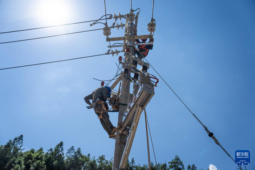 8月7日,在资兴市州门司镇燕窝村,电力工人在抢修电力设施。