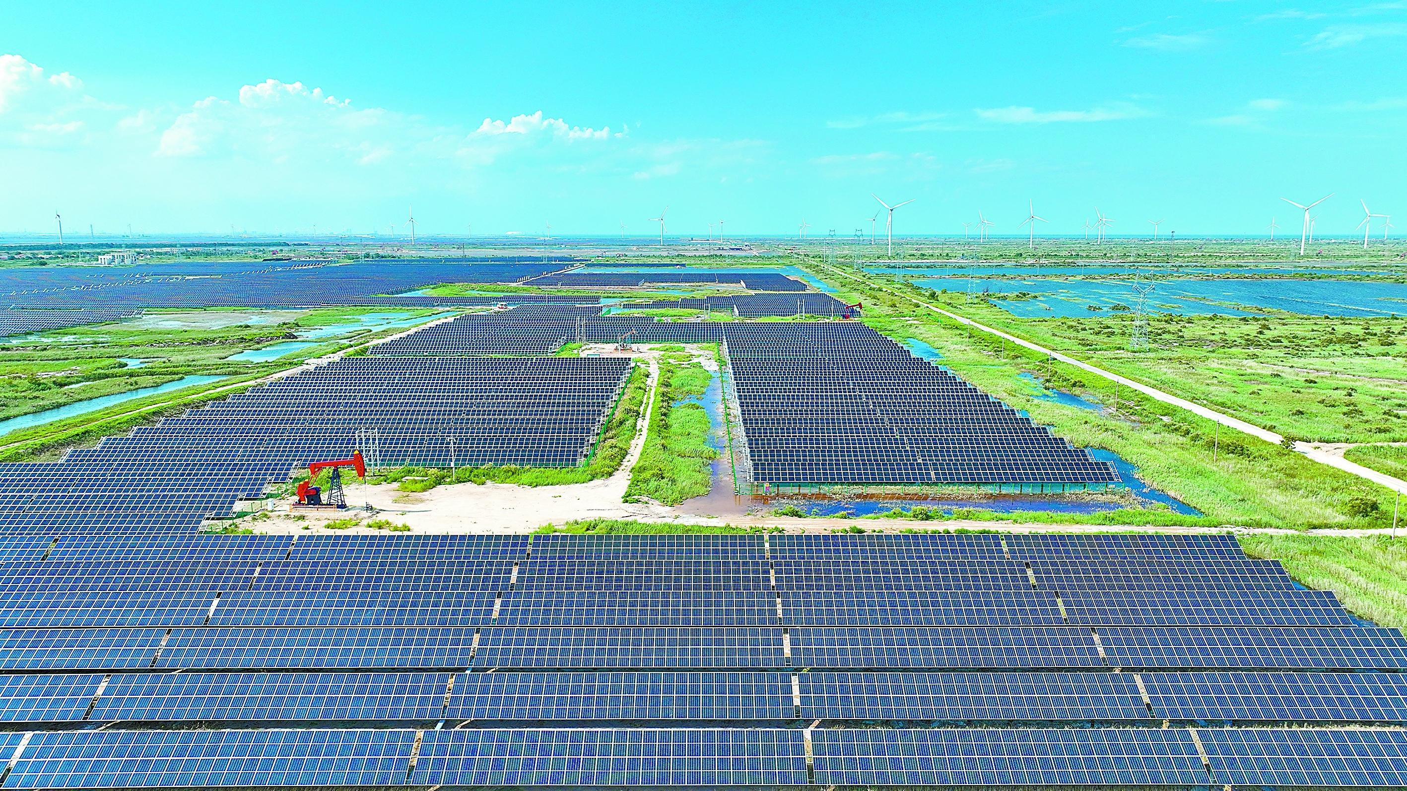 近年来,胜利油田积极重塑产业发展格局,在巩固提升传统油气产业的同时,持续培育壮大新能源产业。截至今年7月底,利用闲置土地资源建成光伏发电装机规模360兆瓦,年发电能力4.32亿千瓦时,油气生产绿电占比达到23%。图为胜利油田首个集中式光伏发电项目——孤东106兆瓦集中式光伏项目现场。王国章 摄 王 磊 文