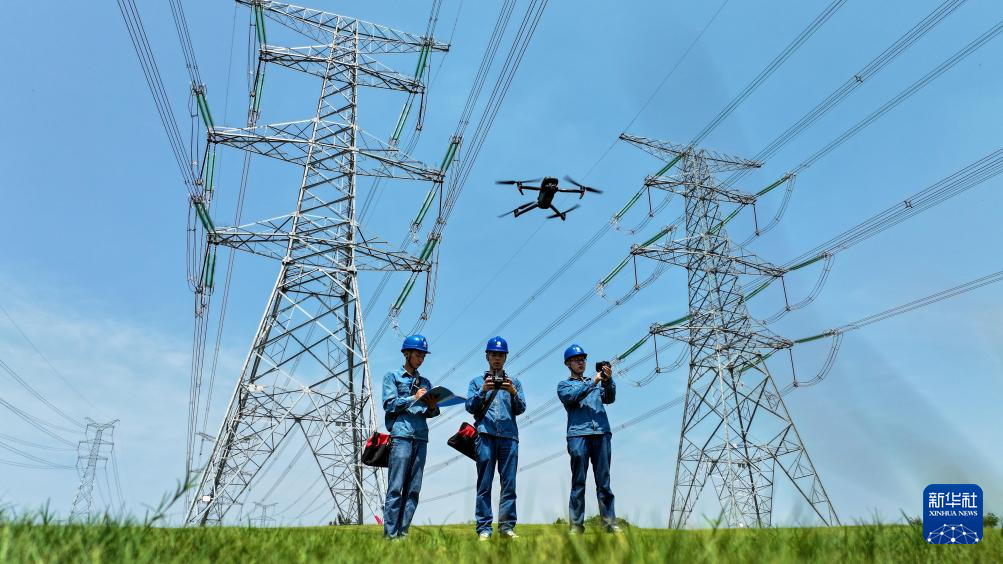 8月9日,在安徽省滁州市南谯区,电力工人运用无人机对500千伏输电线路进行巡视检查。