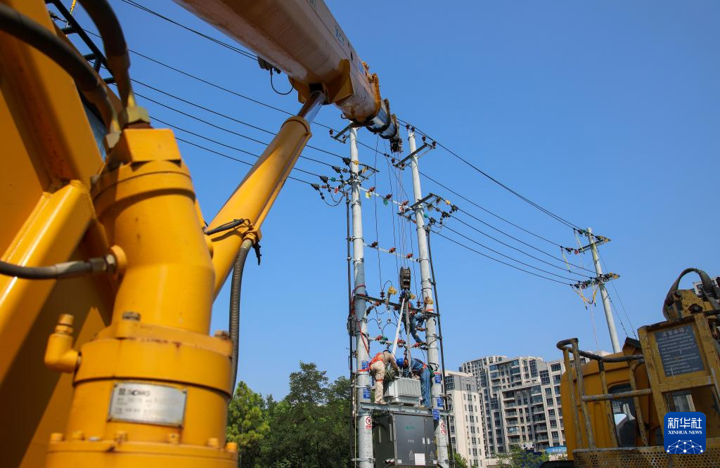8月9日,在安徽省滁州市南谯区,电力工人在对省际联络线及配电设施进行检修。
