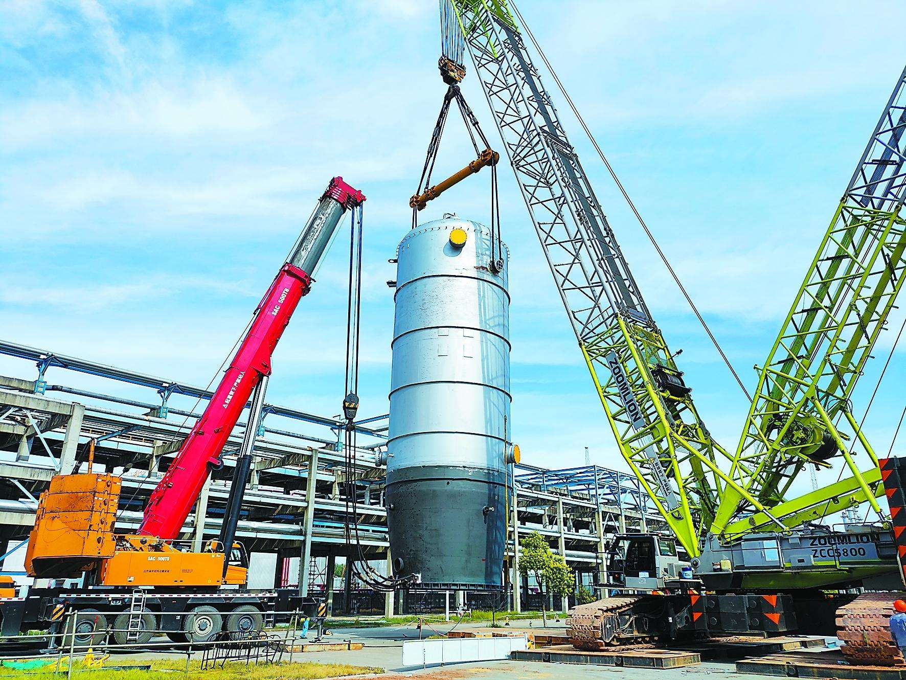 8月9日,十建公司承建的中韩石化2024年乙烯检修改造项目首台大型设备——乙烯装置裂解气干燥器安装就位。该装置重达254吨,是乙烯检修改造项目中单台重量最大的设备,其就位标志着项目整体进入设备安装阶段。图为施工现场。本报记者 田元武 摄