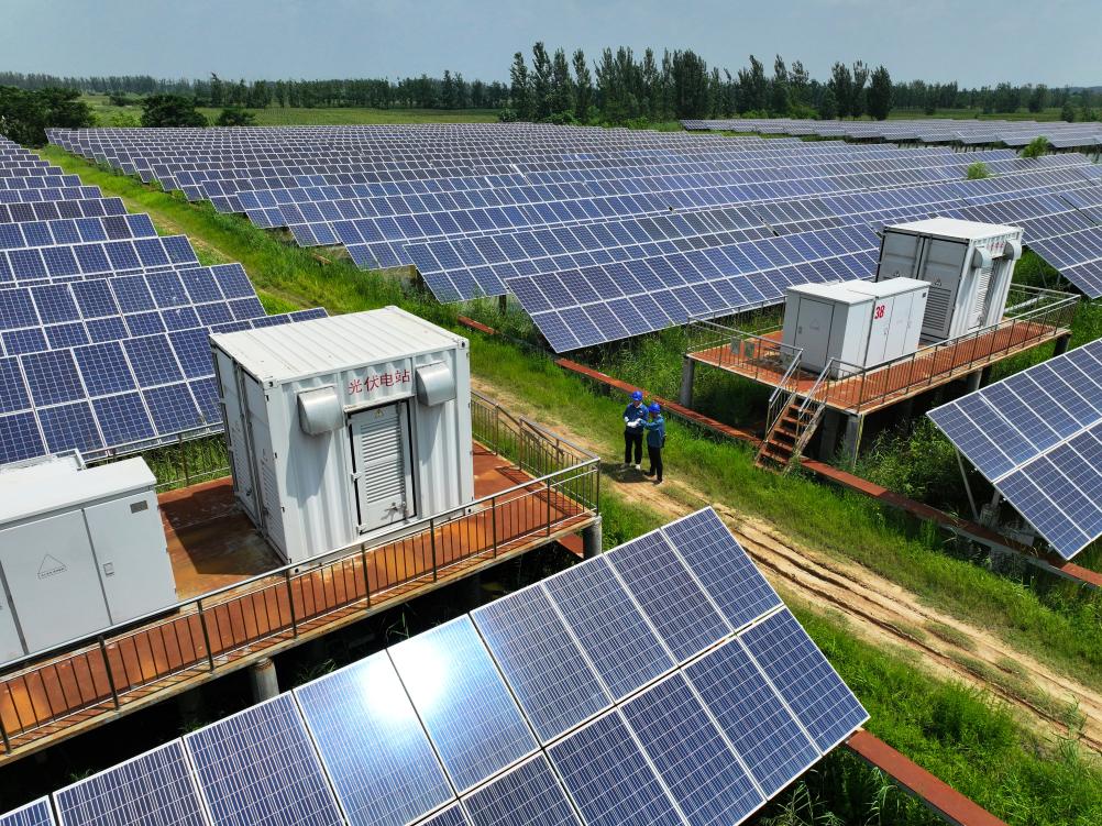 在菏泽市曹县昌光40兆瓦渔光互补光伏电站,当地供电部门工作人员上门开展用电检查。新华社发(受访者供图)
