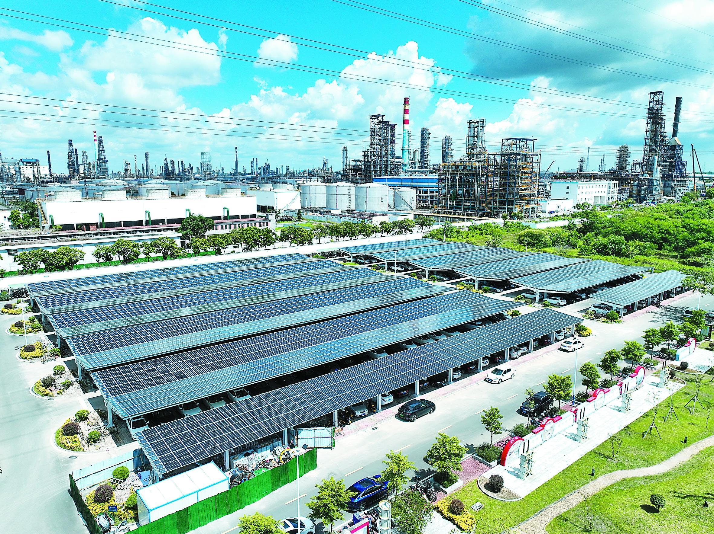 8月15日,茂名石化新光伏发电项目——炼油分部停车场光伏发电项目并网发电成功。长期以来,茂名石化依托厂房屋顶、水池上部空间等闲置区域,以合同能源管理或项目合作等方式,建设分布式光伏发电系统,全力打造零碳办公区。截至目前,累计建成投用光伏项目38兆瓦,年发电量可达4200万千瓦时。图为项目现场。柯裕清 摄 张亚培 文