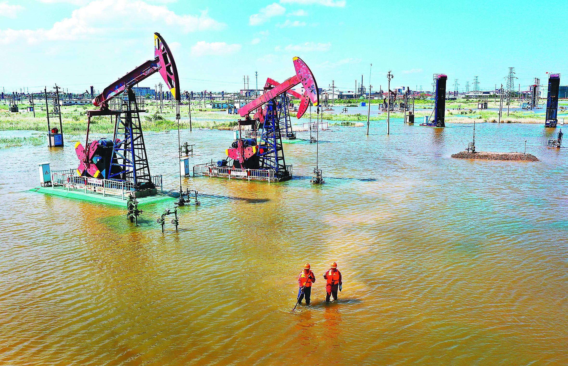 8月26日,胜利油田各油区普降暴雨到大暴雨,局部特大暴雨,部分区域24小时降水量突破历史极值。该油田第一时间成立应急抢险队伍,加大设备设施巡检力度,组织专业人员对关键生产设备、电力设施等进行细致检查,及时发现并排除隐患,保障生产安稳运行。图为8月27日胜利采油厂员工蹚水到井场巡检。朱克民 摄 于 佳 文