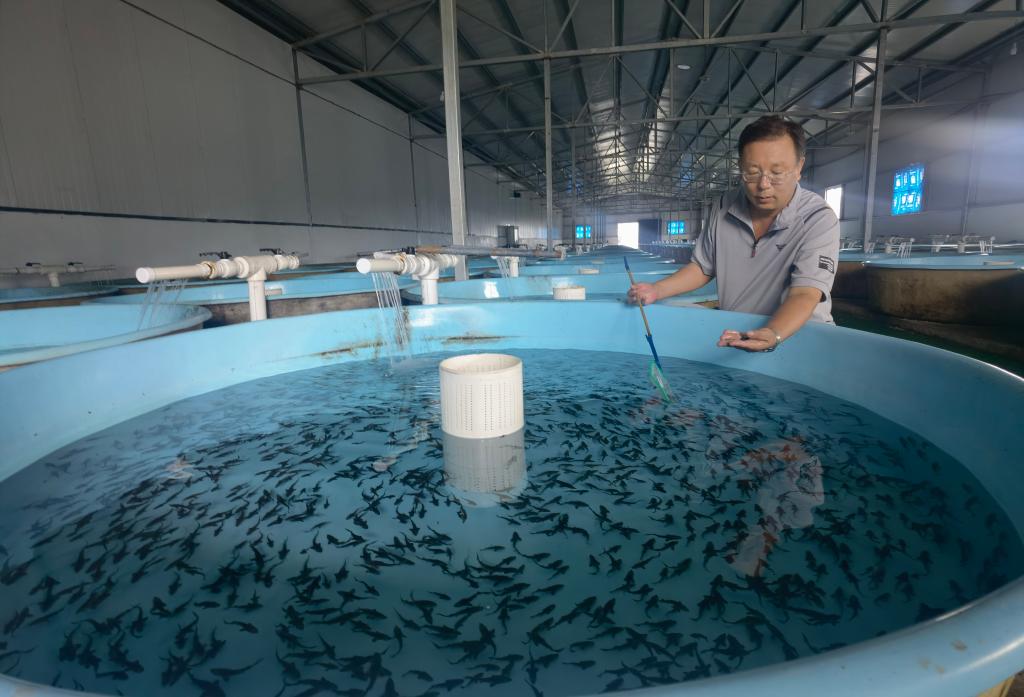 邯郸市鲟鲵农业科技股份有限公司工作人员查看鲟鱼鱼苗长势。新华社记者王昆摄