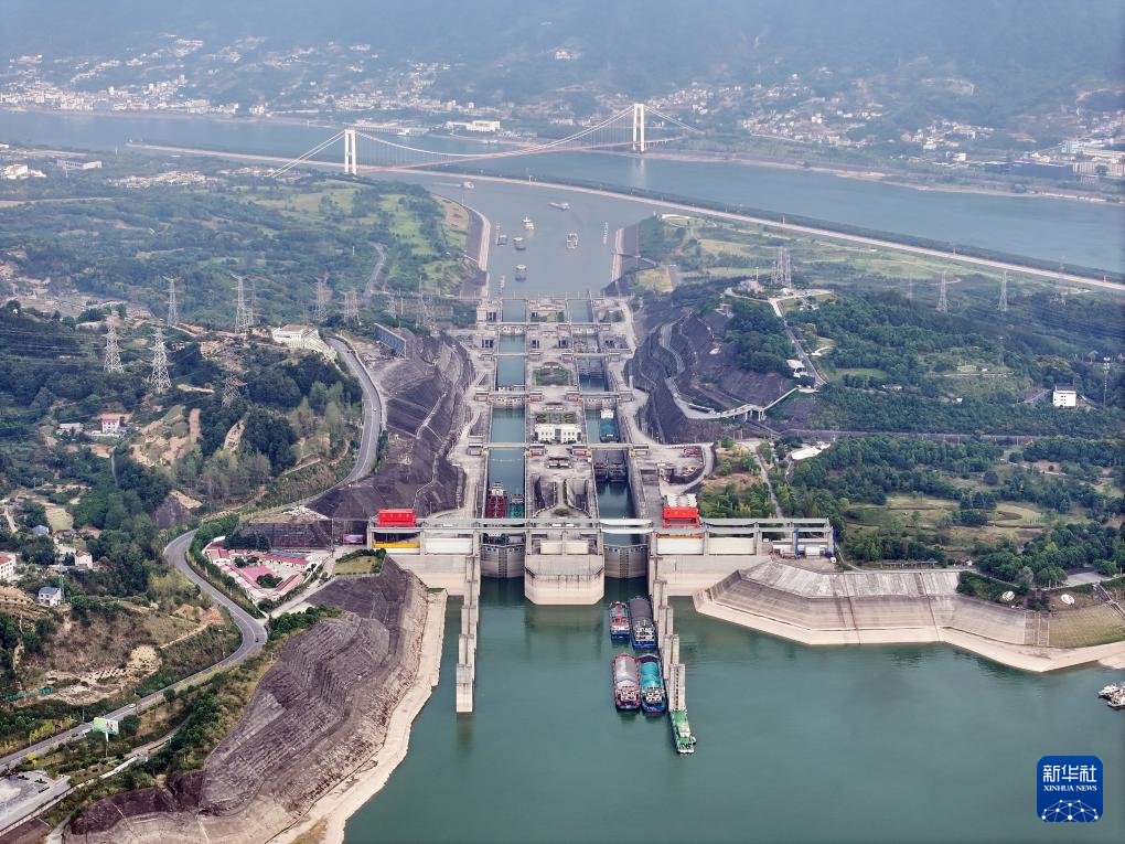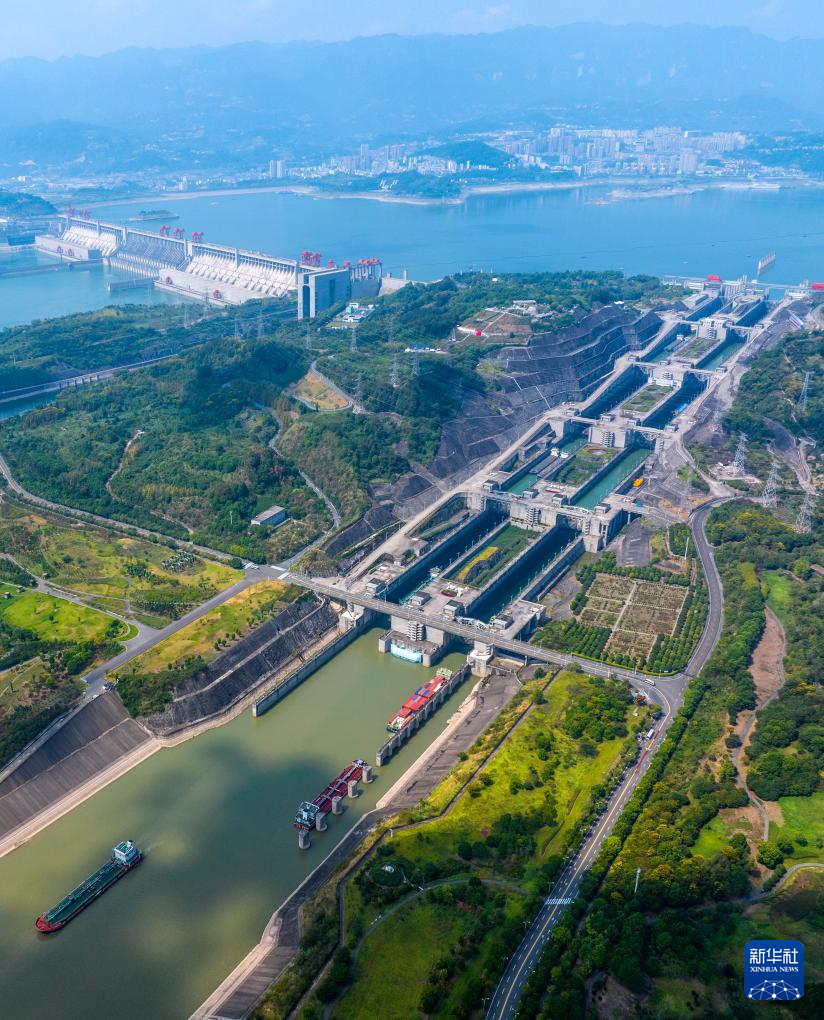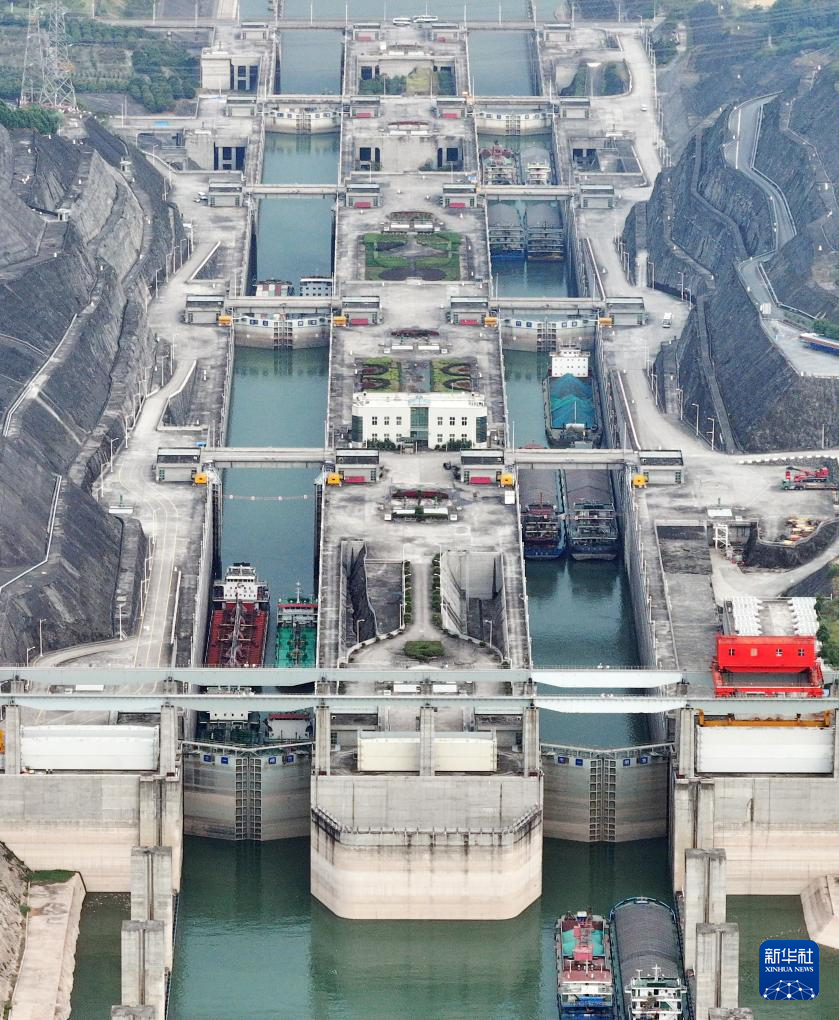 9月10日,在湖北省宜昌市,船舶有序通过三峡枢纽双线五级船闸(无人机照片)。