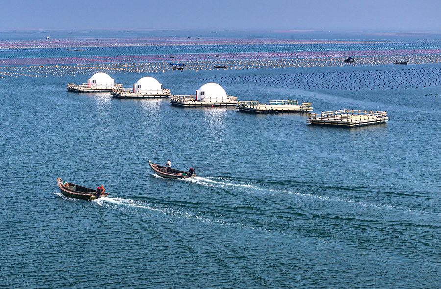 2024年8月16日,在山东省荣成市俚岛镇俚岛湾海域生态养殖区,渔民驾驶渔船出海作业(无人机照片)。新华社发