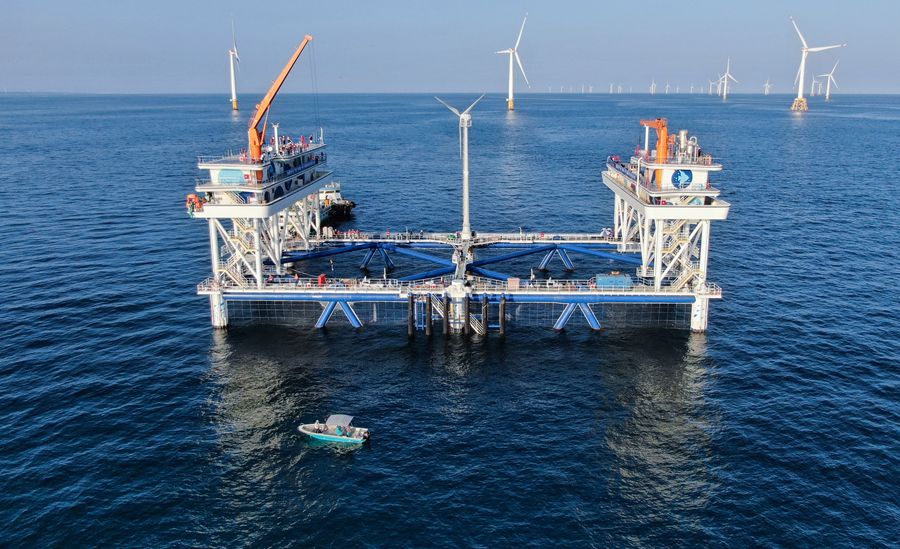 9月4日,超大型风渔融合网箱平台——中广核“伏羲一号”正式在广东汕尾建成投运。这是9月2日拍摄的中广核“伏羲一号”风渔融合网箱平台(无人机照片)。新华社发
