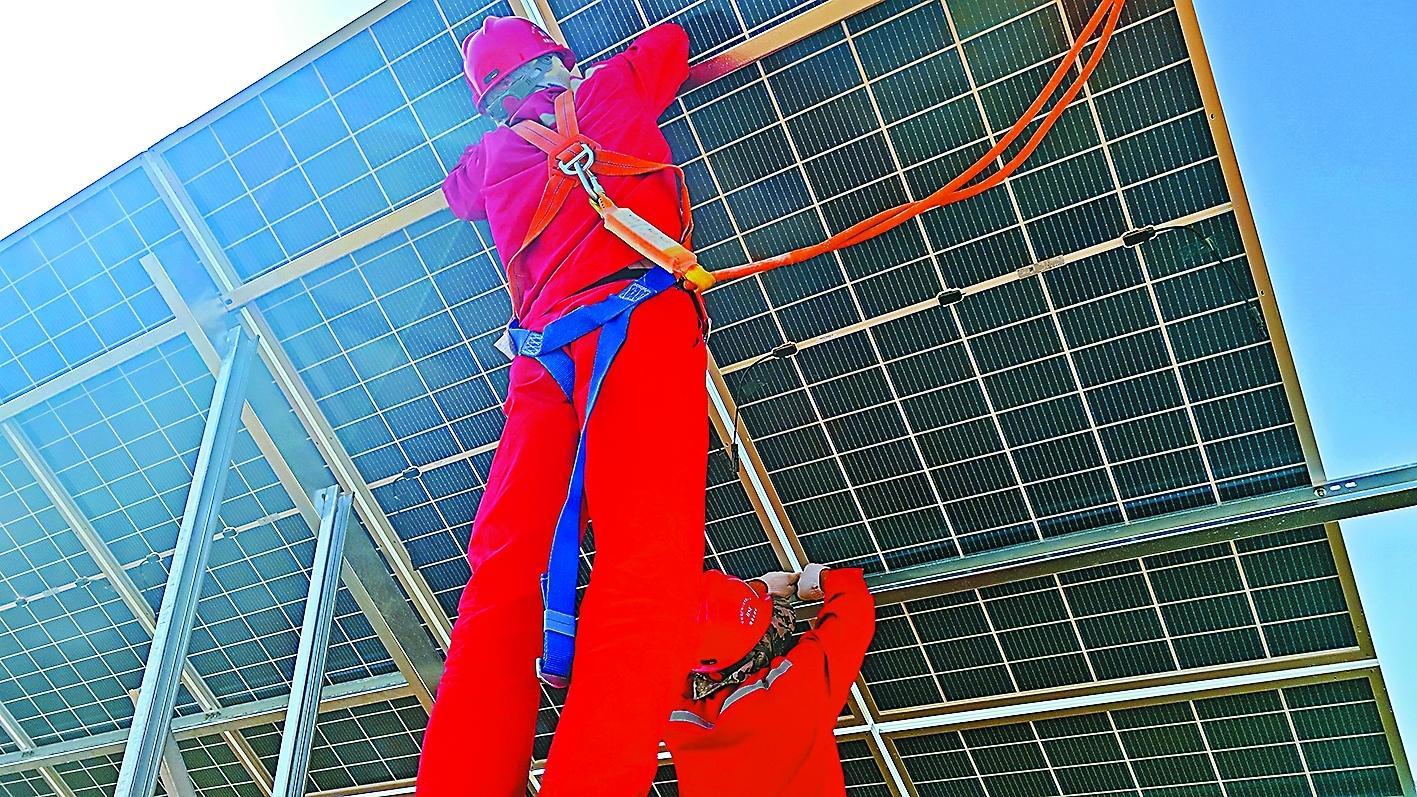 在300余天的努力奋斗过程中,建设者们一直保持高效率运转,像向日葵一样,追寻着太阳的起落,用智慧和汗水攻克了一个又一个光伏设备安装难题。
